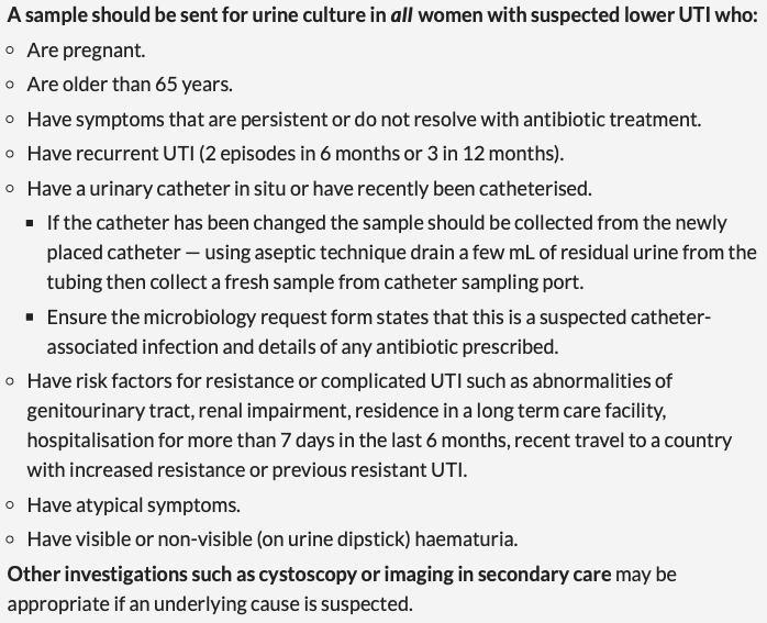 • <65 years old woman: Urine Dipstick. If positive Ni or Leu and RBC then likely UTI so only send MSU if previous antibiotic treatment has failed. If negative Ni but positive Leu send for MSU. If all negative then clear