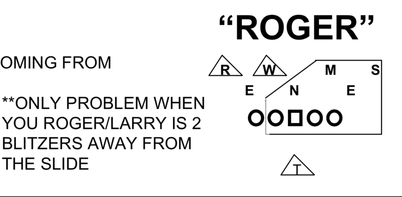 THIS IS A SLIDE STARTING WITH THE BACKSIDE GUARD. THE O-LINE IS RESPONSIBLE FOR THE 3 D LINEMEN AND 1ST 2nd BLITZER ON SLIDE SIDE. RB HAS EVERYONE ELSE AWAY FROM THE SLIDE SIDE.