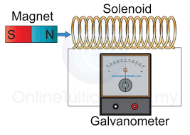 When the magnet is moved into the coil, a current is induced and the needle on the ammeter moves to the left.