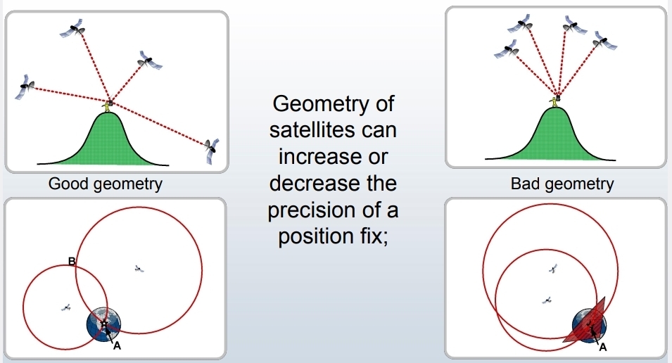 Better GPS accuracy is obtained by points that are well separated. When different satellites have different precision values, the overall precision is diluted. The time difference between the signals is greater when they are further apart because they are at greater angles relative to eachother.