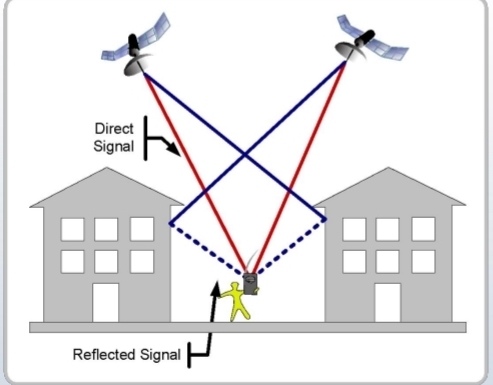 Reflection of satellite signals causing difference path lengths.