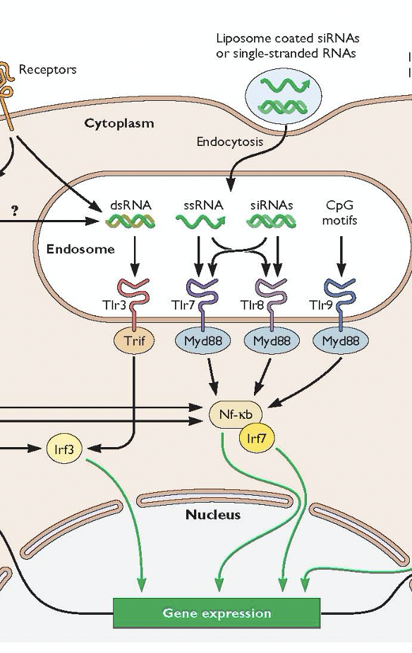 TLRs= sense RNA in endosomes (mainly on dendritic cells)