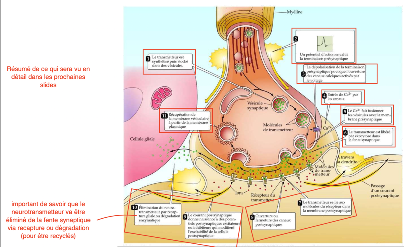 1) Neurotransmetteur est synthétisé et stocké dans le neurone.
