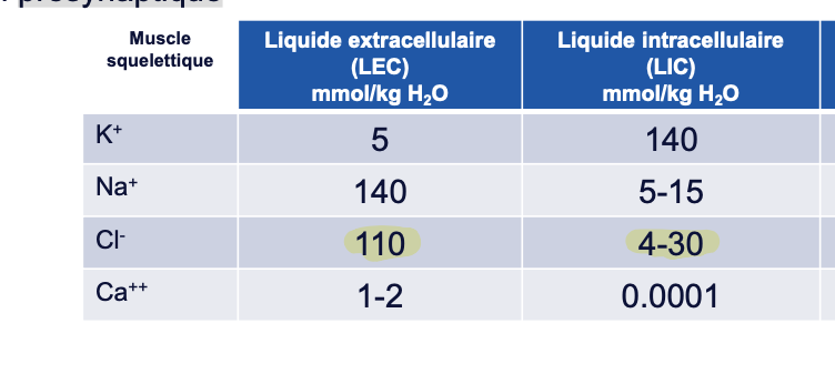 Combien a t-il de K, NA, Cl, Ca dans le liquide extracellulaire, intracellulaire