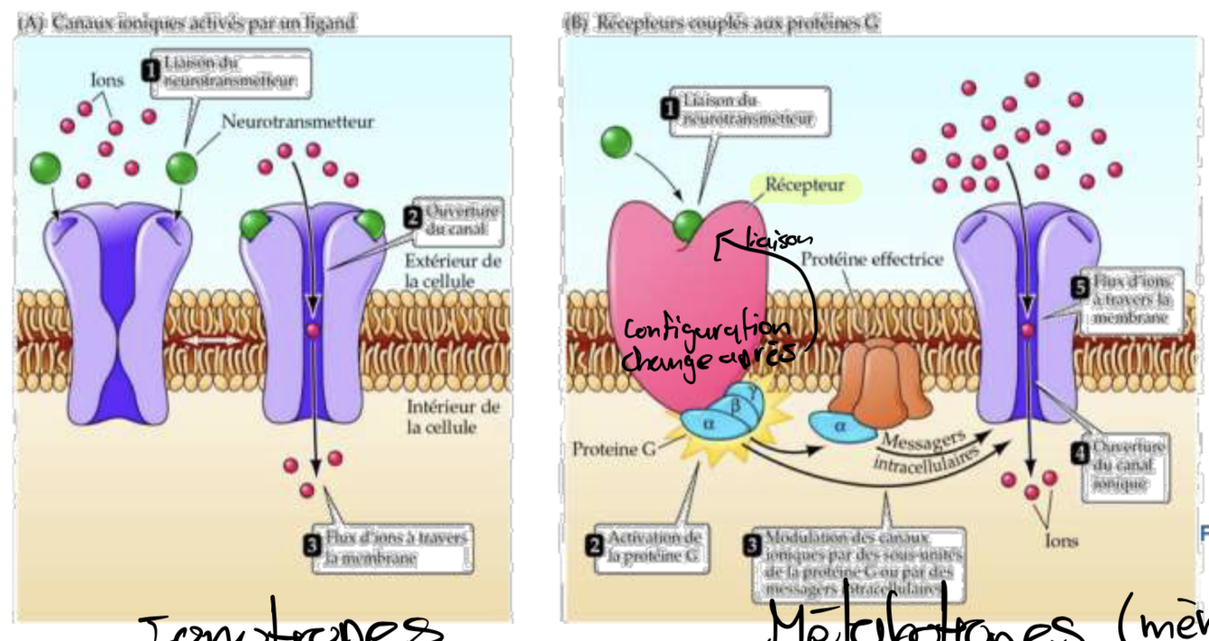 Dans le fond le récepteur métabotropes va envoyer un signal pour activer un canal d’ion un peu plus loin. Mais ce n’est pas nécessairement la seule action finale du récepteur métabotropes. Le principe est cependant que le récepteur n’est pas un canal ion, mais qu’il va voir un effet sur un canal via INTRACELLULAIRE par une protéine G.