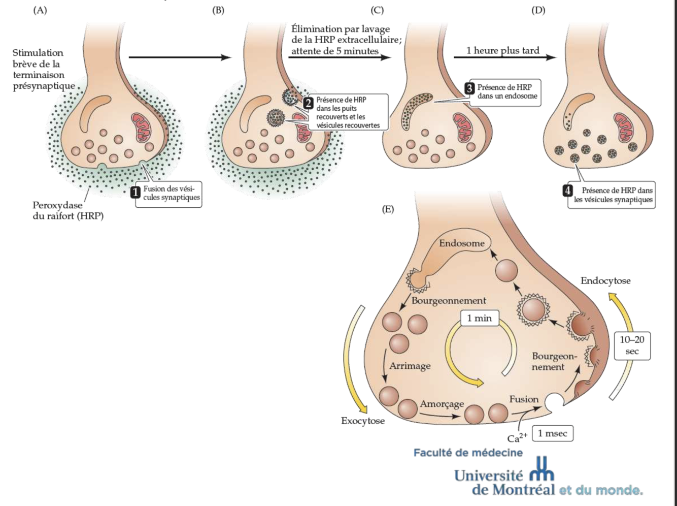 Le peroxydase de raifort (HRP) est un marqueur. Il se retrouve rapidement dans les vésicules recouvertes, puis dans les endosomes, puis dans les nouvelles vésicules synaptiques.