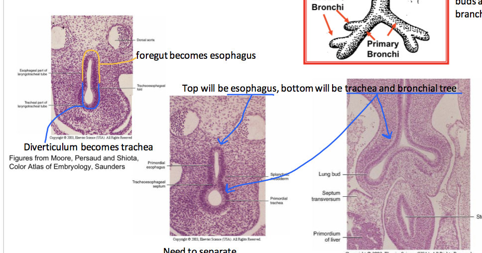 A diverticulum comes off the developing foregut and begins to branch. The foregut becomes the esophagus and the diverticulum becomes the trachea.