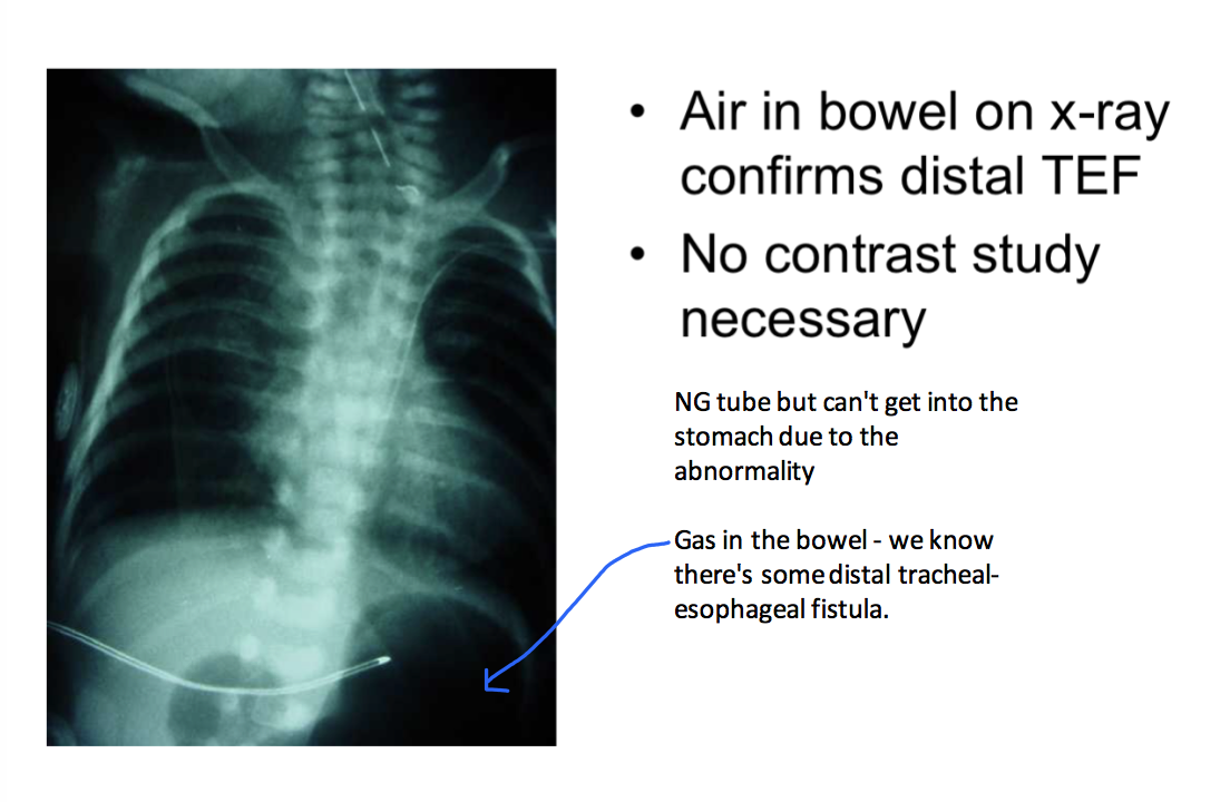 Air in bowel on xray confirms distal tracheoesophageal fistula. You can often tell because the NG tube can’t be placed.