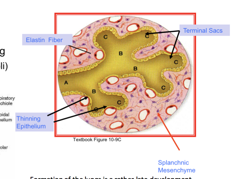 Alveolar phase: alveoli formation begins by subdivision of terminal sacs (septation); alveolar septum (walls) become thinner