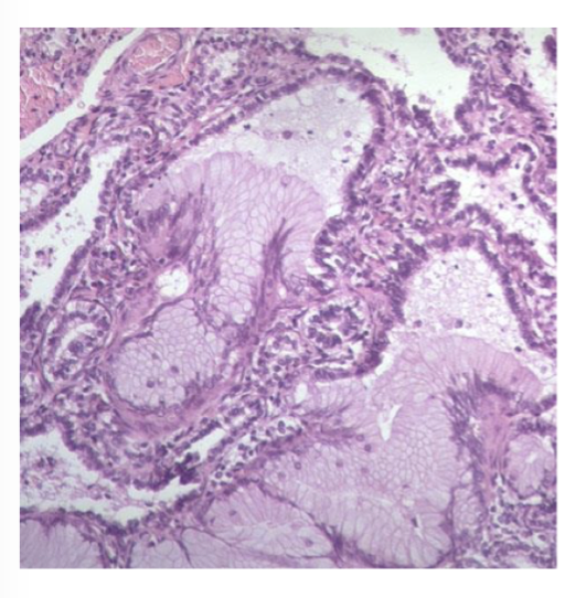 Alveolar spaces lined by a combination of both respiratory and mucus-secreting epithelium, forming glandular (“adenomatoid”) architecture.