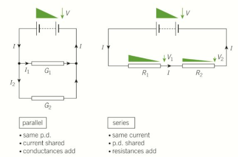 How are pd, current, conductance and resistances shared in parallel and series circuits?
