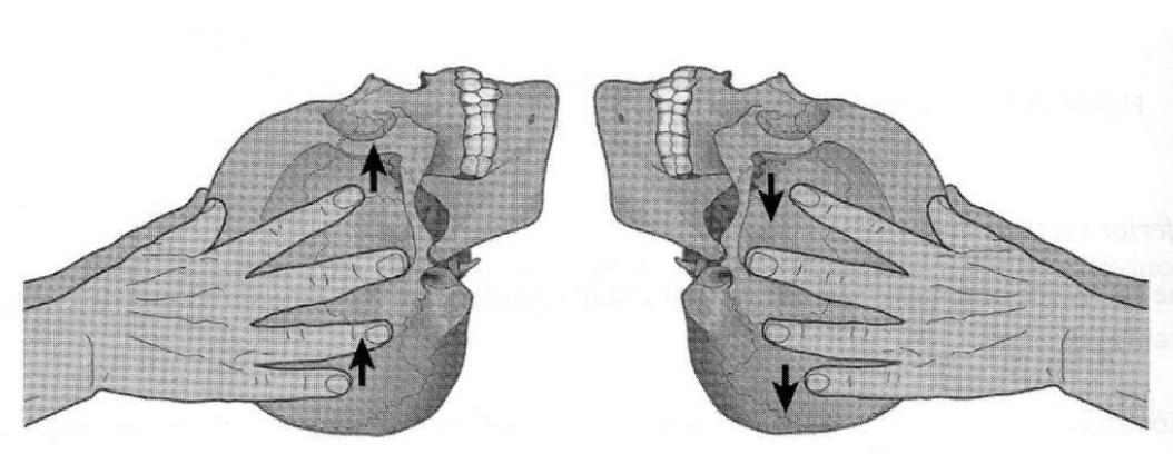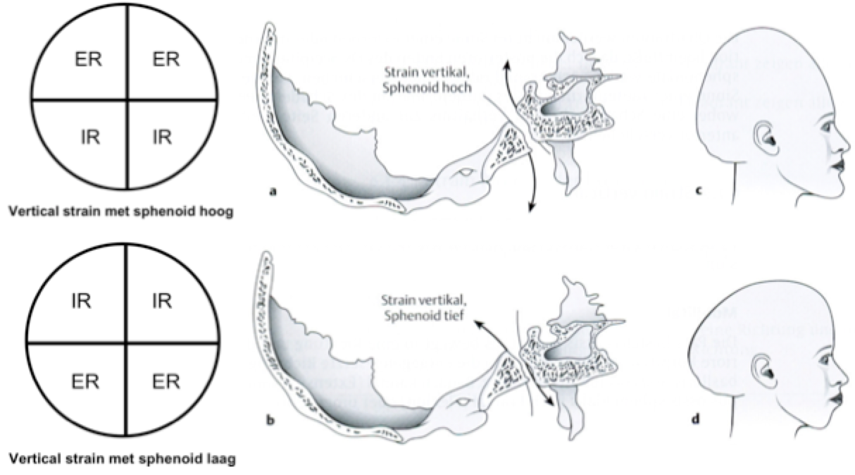 Opmerking: In het geval van een vertical strain hoog in translatie is de impuls op ala major/frontale naar superior, op os occipitale naar inferior. Bij langer bestaande vertical strain in translatie kan mogelijks een trapvorming gevoeld worden ter hoogte van de sutura coronalis.