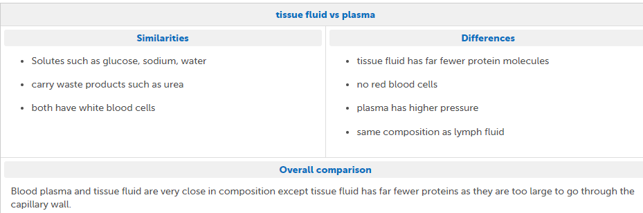 Tissue fluid vs plasma