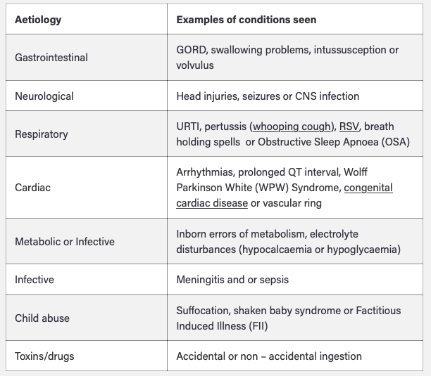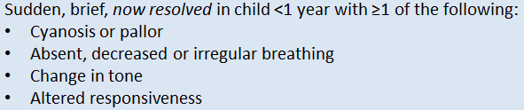 An event occurring in an infant younger than 1 year when the caregiver reports a sudden, brief (<1 minute) and now resolved episode of ≥1 of: