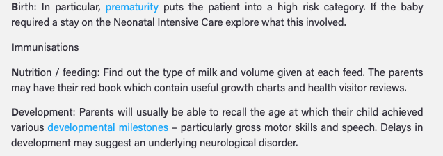 General: Vital signs, BM, Growth (weight and head circumference), dysmorphic features, any bruises or marks suspicious of NAI