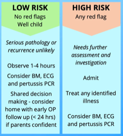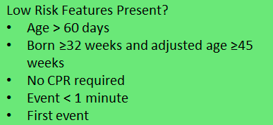 To guide investigations and management of BRUE, children are stratified as high risk or low risk. What are some low risk features?