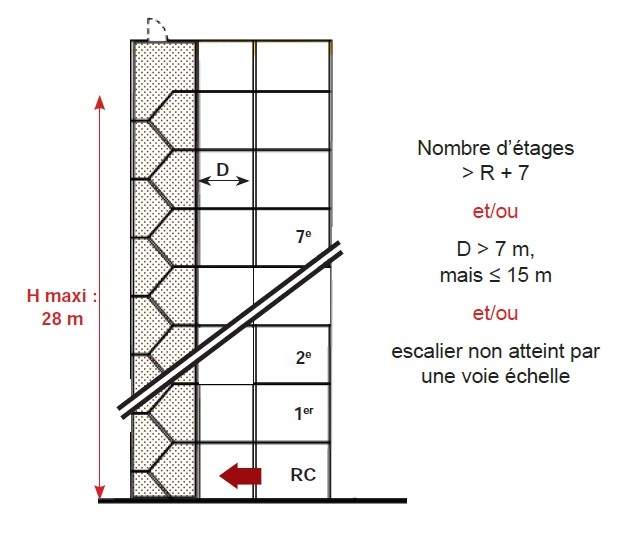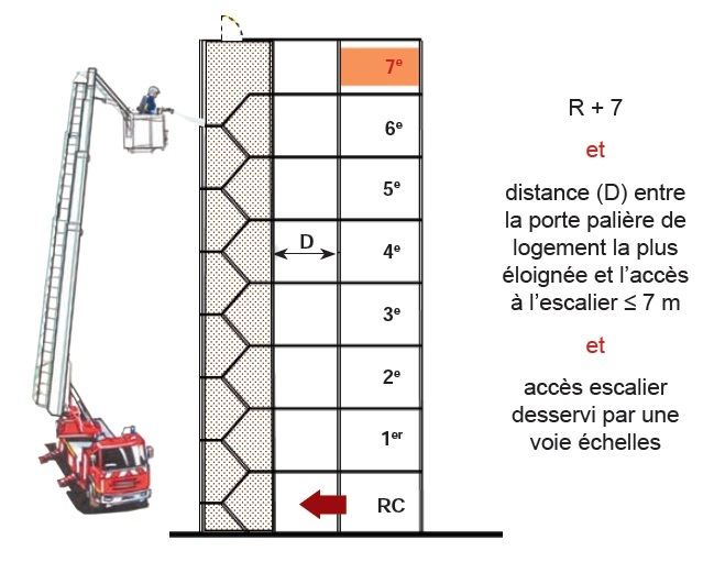 Les IGH se trouvent à une distance de 3 km au plus d’un centre de secours.La distance entre les sorties des immeubles et une voie ouverte à la circulation publique ne doit pas excéder 30 m. Cette voie doit permettre la circulation et le stationnement des engins.