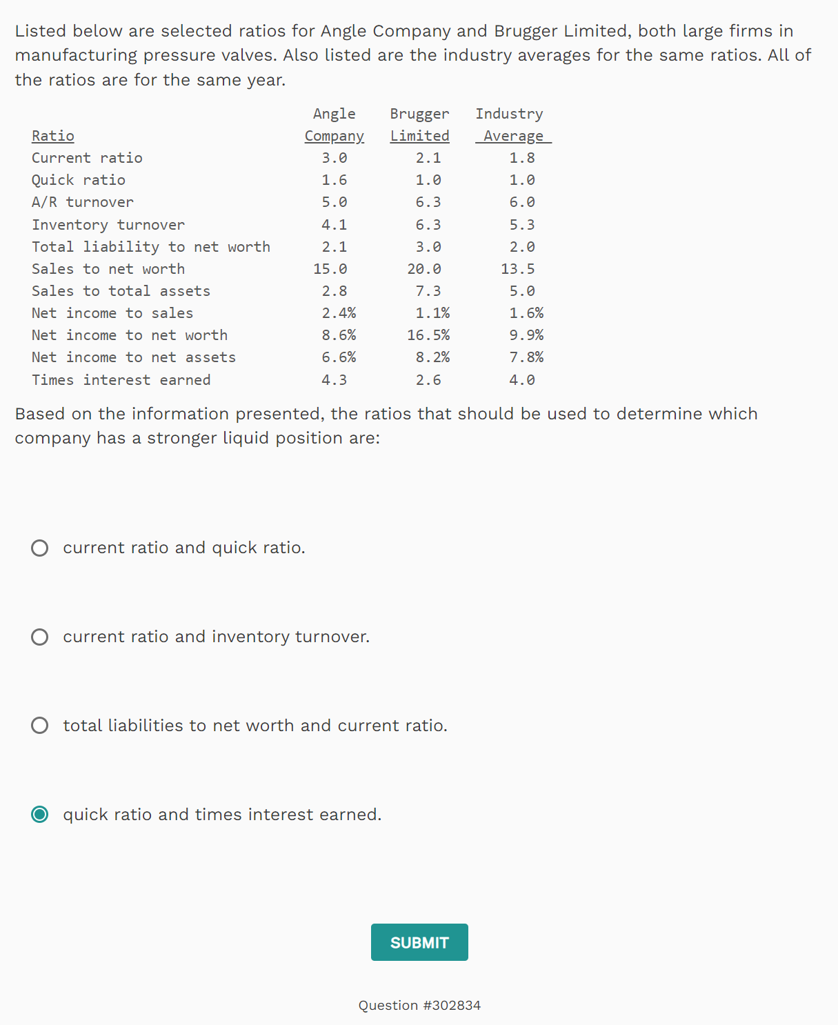 Angle Brugger Industry Ratio Company Limited Average Current ratio 3.0 2.1 1.8 Quick ratio 1.6 1.0 1.0 A/R turnover 5.0 6.3 6.0 Inventory turnover 4.1 6.3 5.3 Total liability to net worth 2.1 3.0 2.0 Sales to net worth 15.0 20.0 13.5 Sales to total assets 2.8 7.3 5.0 Net income to sales 2.4% 1.1% 1.6% Net income to net worth 8.6% 16.5% 9.9% Net income to net assets 6.6% 8.2% 7.8% Times interest earned 4.3 2.6 4.0 Based on the information presented, the ratios that should be used to determine which company has a stronger liquid position are: