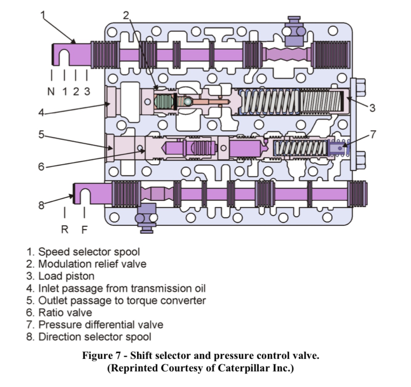 In a basic hydraulic shift control system, transmission speed and direction changes are made by the: