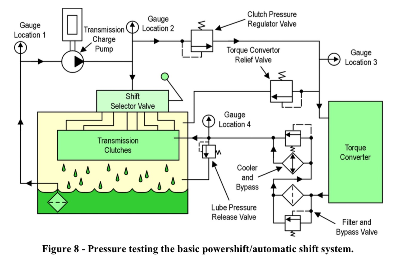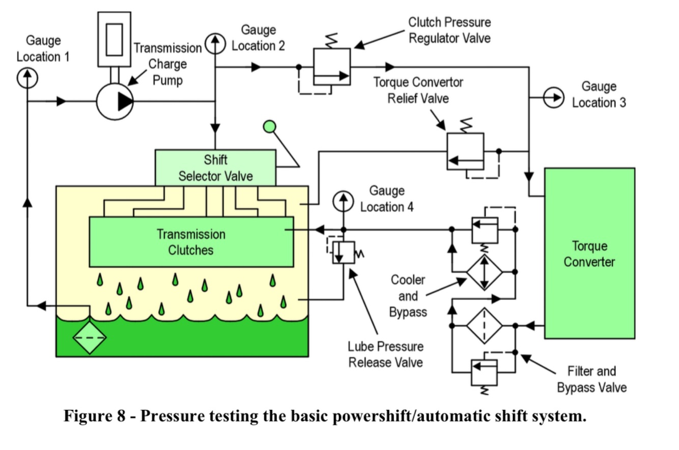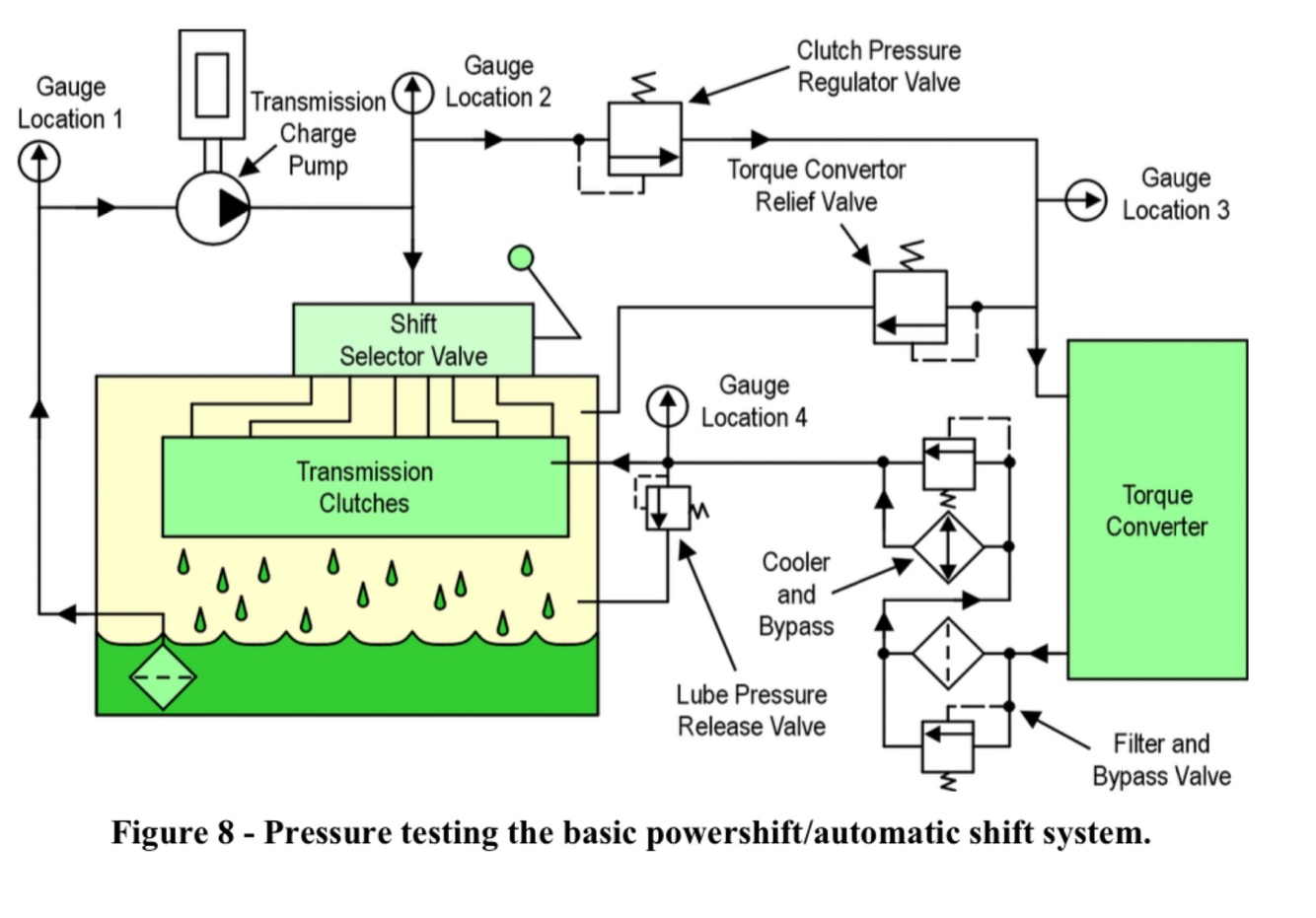 Where do you have to place a pressure gauge to read available clutch application pressure in the transmission circuit?