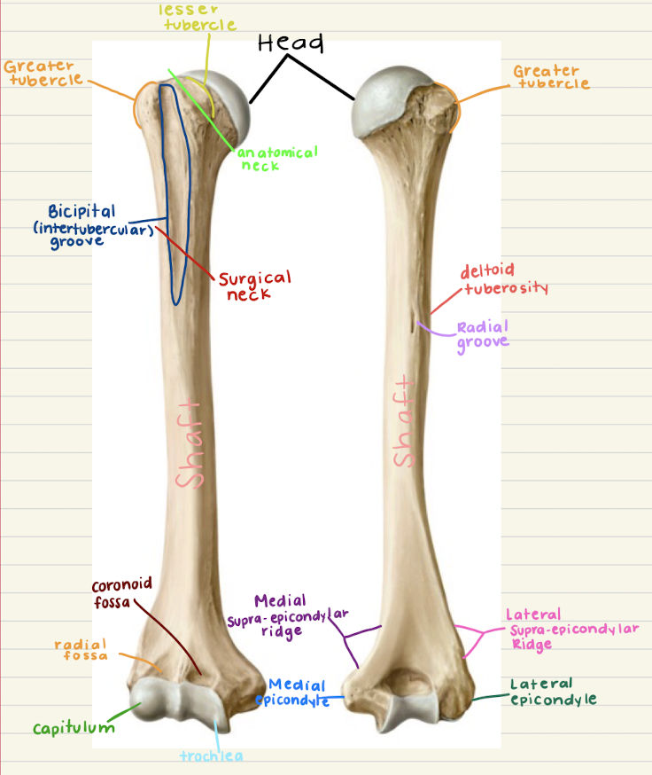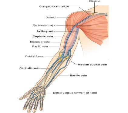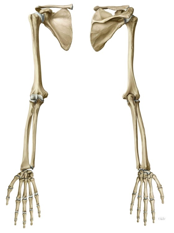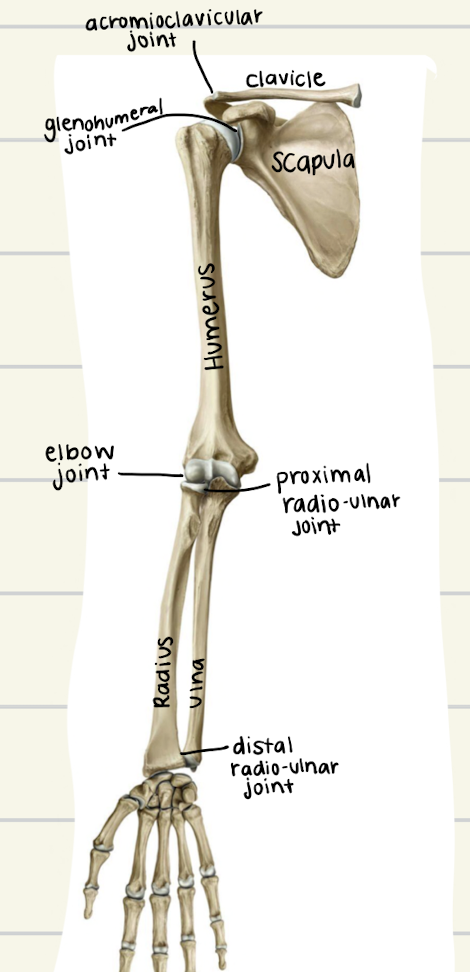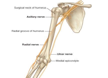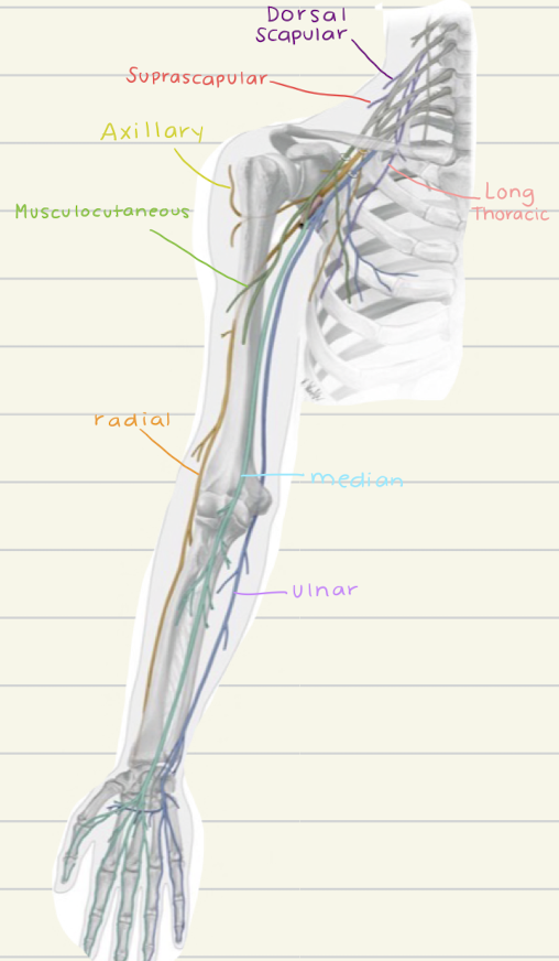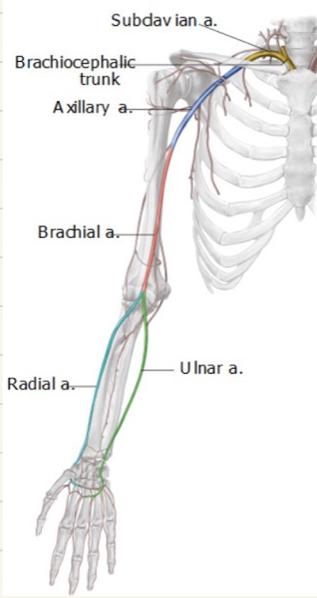 Brachial a. then bifurcates at the elbow forming the radial a. and ulnar a.