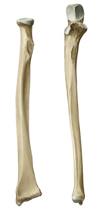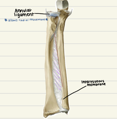 gives off common interosseous branch soon after it originates at the brachial a. bifurcation; it then splits into anterior and posterior interosseous aa. that run along the interosseous membrane