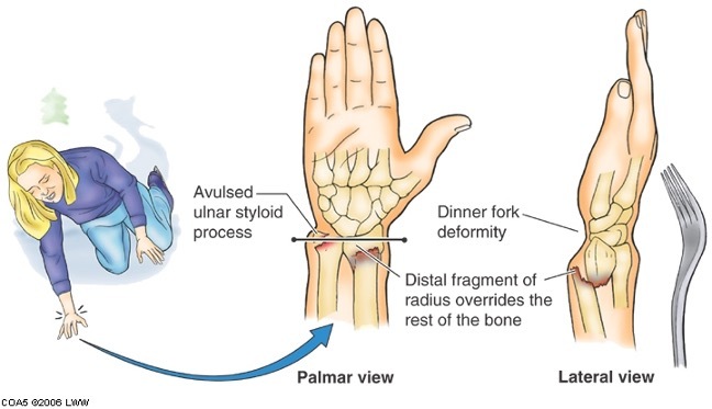 Results from forced extension of hand which occurs when falling on an outstretched arm