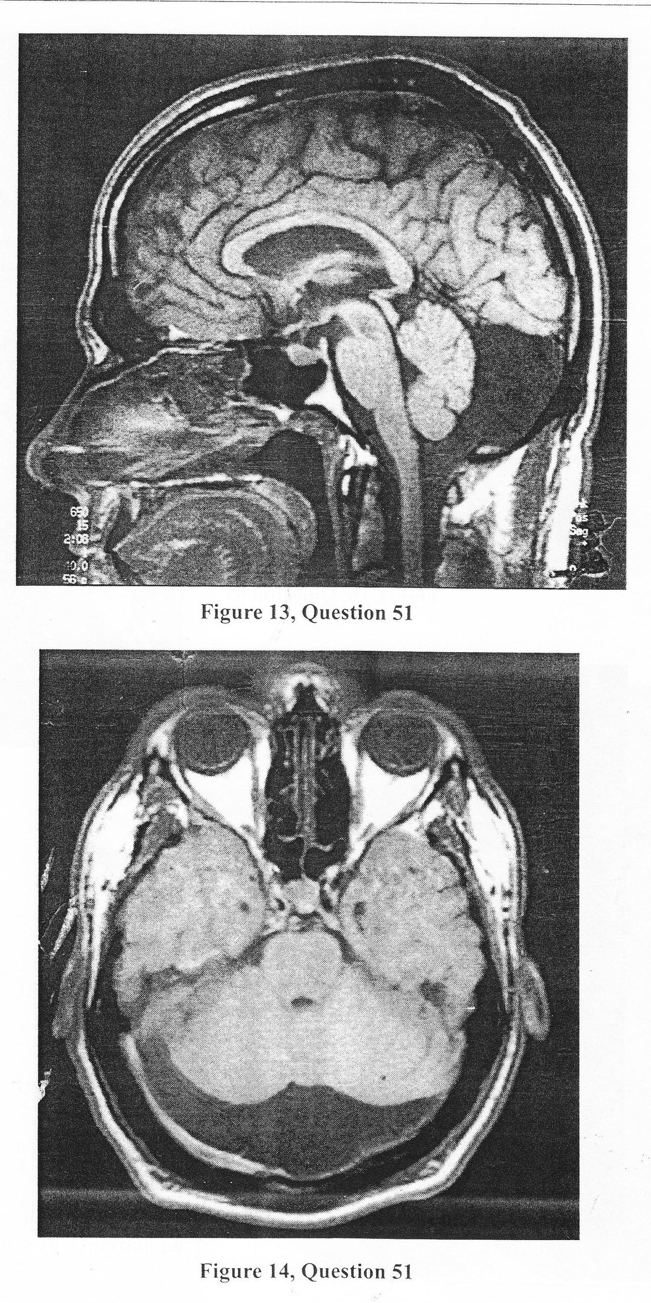 D. The MRI shows thinning of the occipital bone and deformation of the cerebellum.