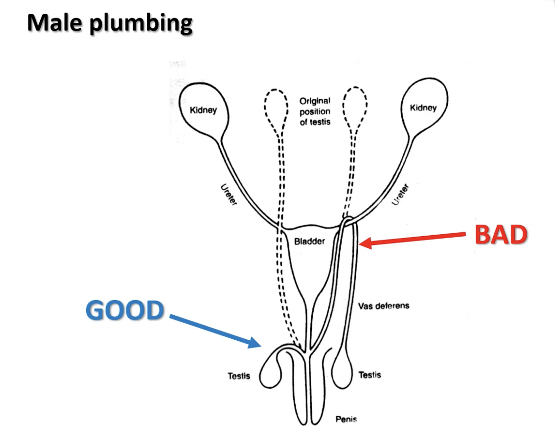 Male plumbing: testes used to be inside the body → two possibilities of ecolution: short vas deference (the tube connecting) or vas deference looping around ureter → bad design persists in males where vas deference is looped