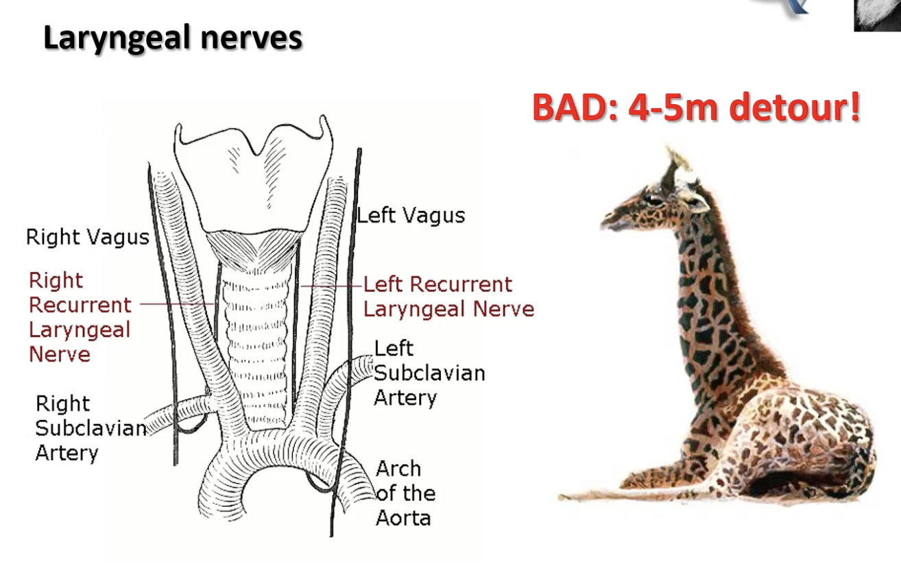In the evolution of other animals from fish - gil slit bones developed _into jaw and ear bone_s → langeal nerves developed to be looped around blood vessels → have to take a detour - go from the jaw into body cavity and back up to the brain → bad design