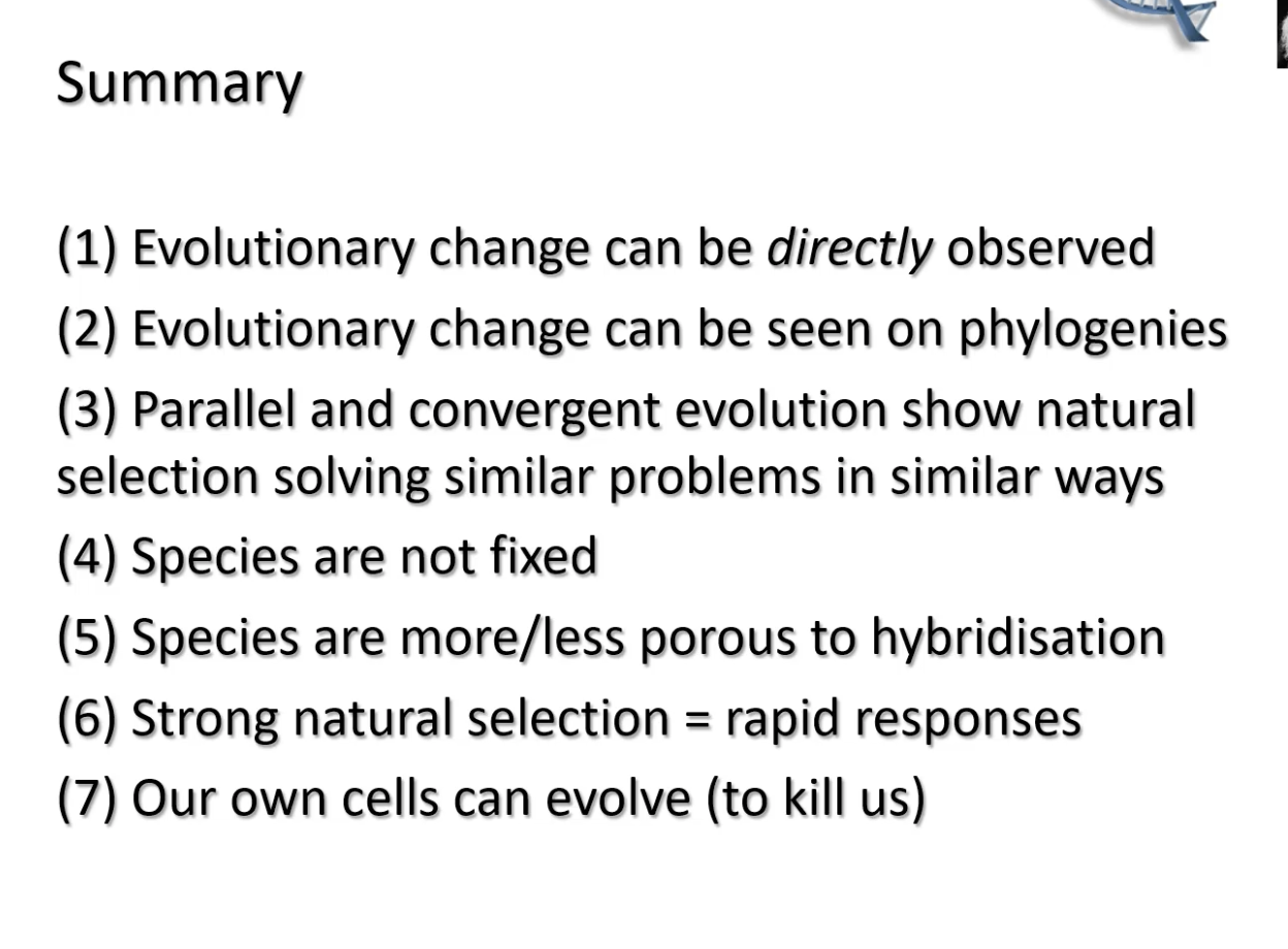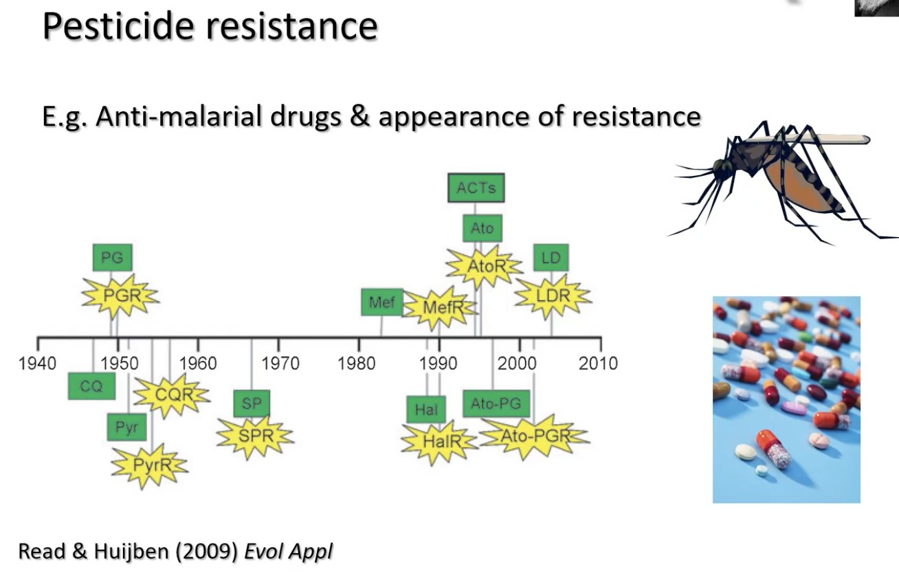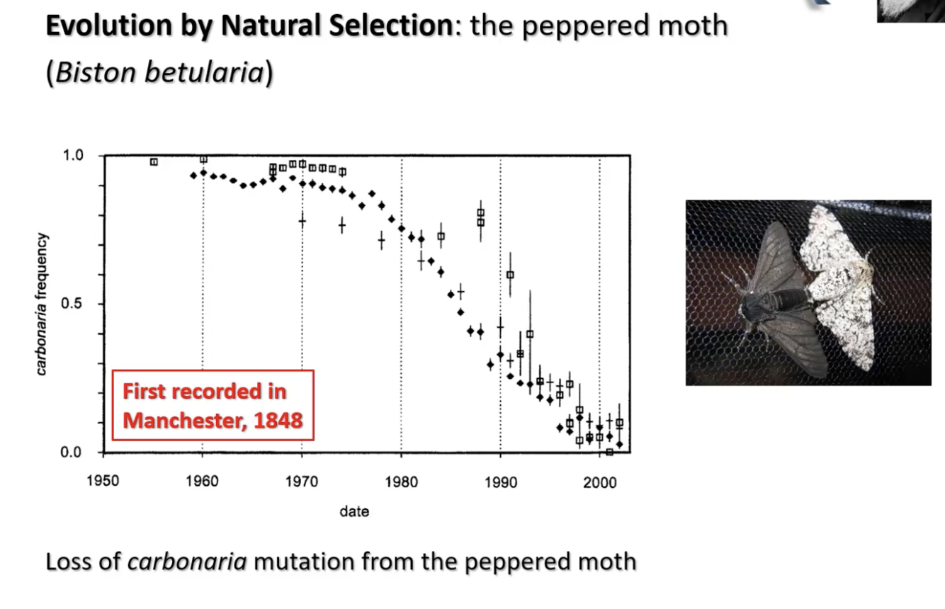 Polution in 19th century in UK → peppered moths developed into different colout black from white because they hide on tree trunks → moths attacked by birds