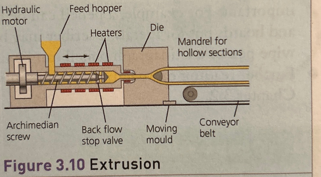 -similar to injection moulding but the polymer is forced through a die at the end