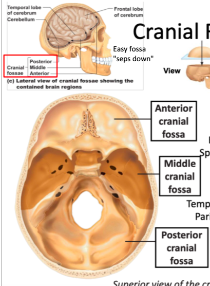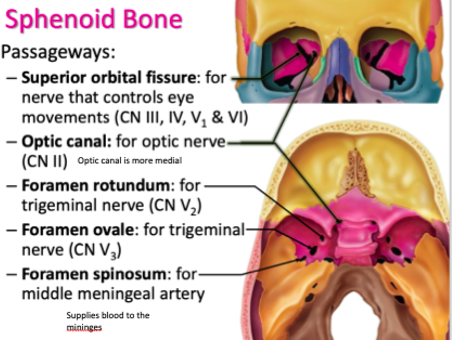 Foramen Spinosum: for middle meningeal artery (supplies blood to mininges