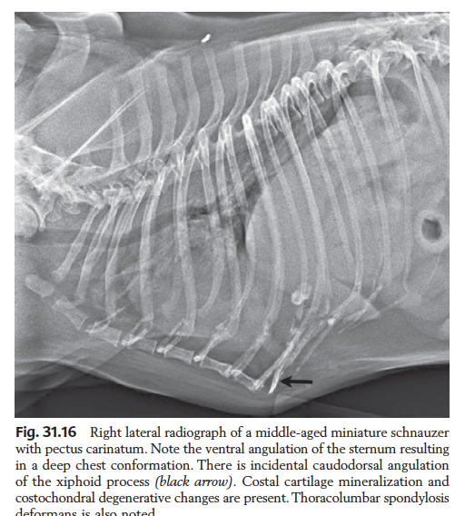 Dachsunds, other chondrosdsystrophic breeds (e.g. basset) -> Hour glass shape to thorax