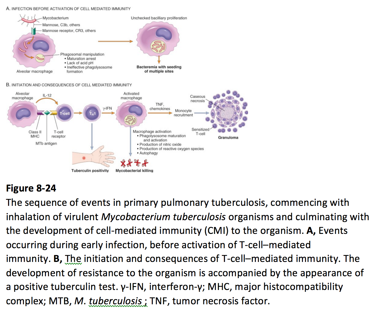 Describe the processes involved in the mycobacterium TB infections prior to activation of a cell mediated immune response, then describe the initiation and consequences of the cell mediated response