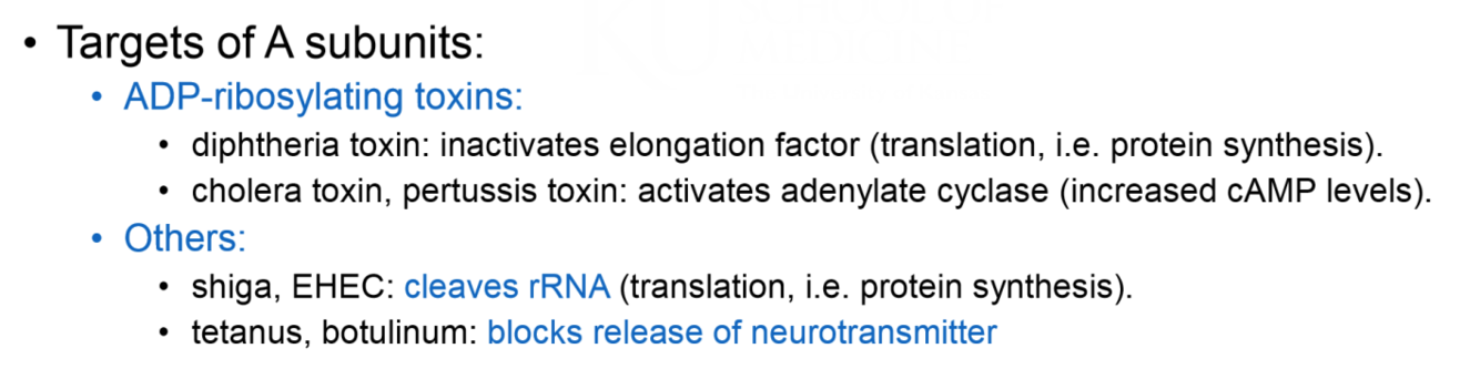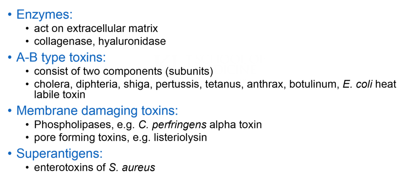 Enzymes, A-B type toxins, membrane damaging toxins, superantigens