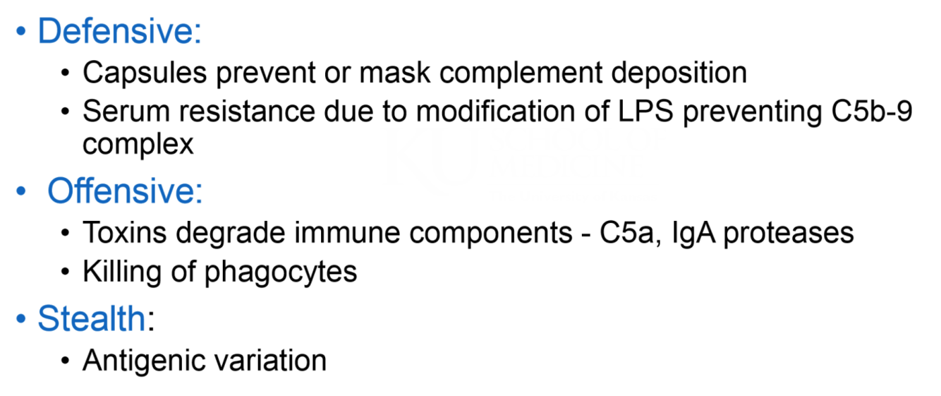 Motility, adhesins, invasins, exotoxins, endotoxins (LPS), degradative enzymes, caspsules, siderophores, resistance to antibiotics