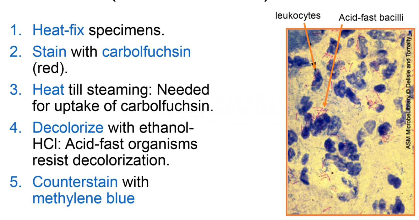 Acid-fast stain (Ziehl-Neelsen): mycobacteria and other acid-fast microorganisms