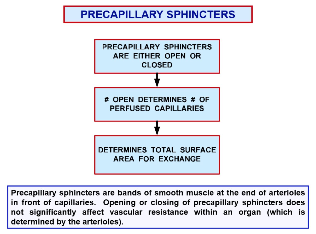 These are bands of smooth muscle at the end of arterioles and in front of capillaries. They are either open or closed, and the number of them that are open determines the number of perfused capillaries. This will determine total surface area for exchange.
