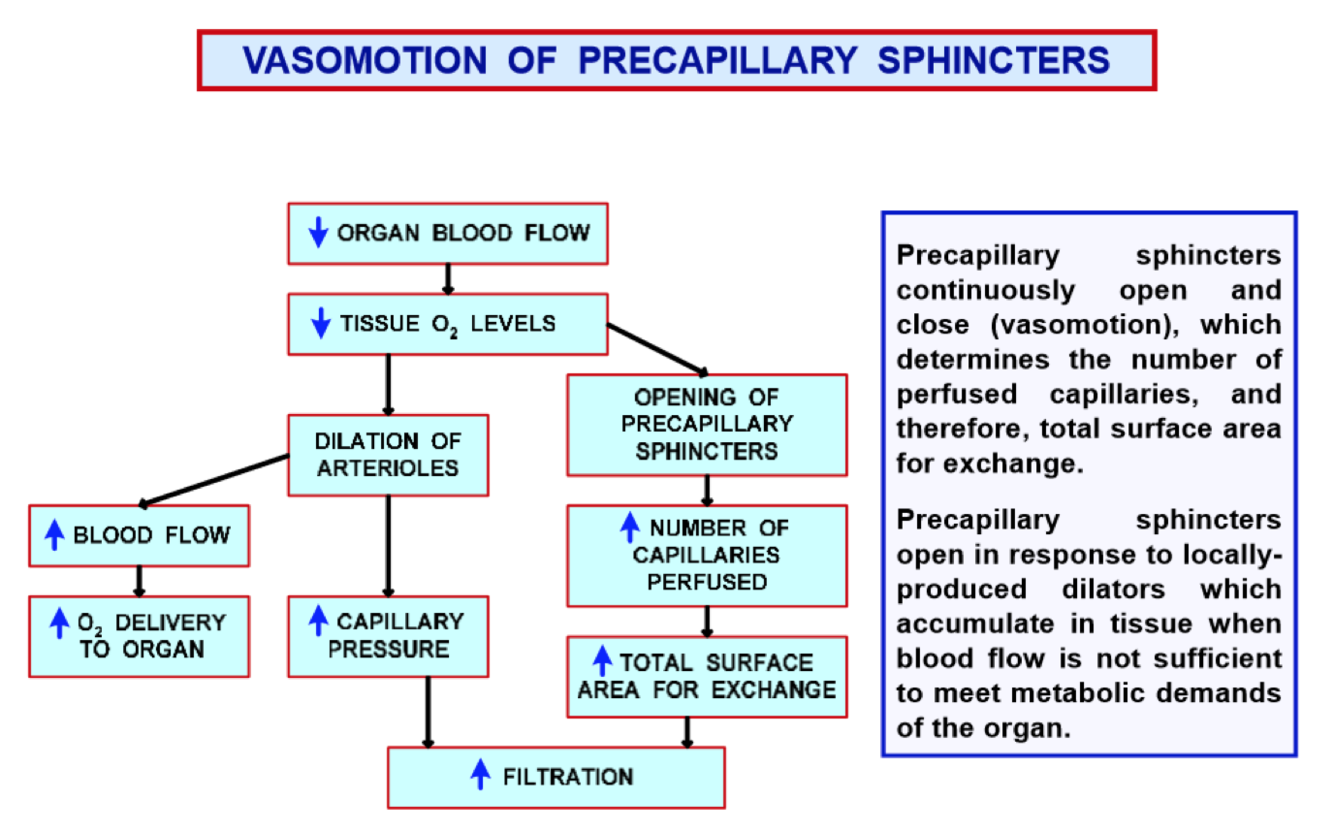 The opening and closing of these determines number of perfused capillaries, and therefore total surface area for exchange. These open in response to locally produced dilators which accumulate in tissue when blood flow is not enough.