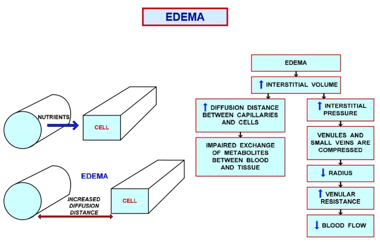 Impaired exchange of metabolites between blood and tissue. Increased interstitial pressure leading to decreased blood flow.