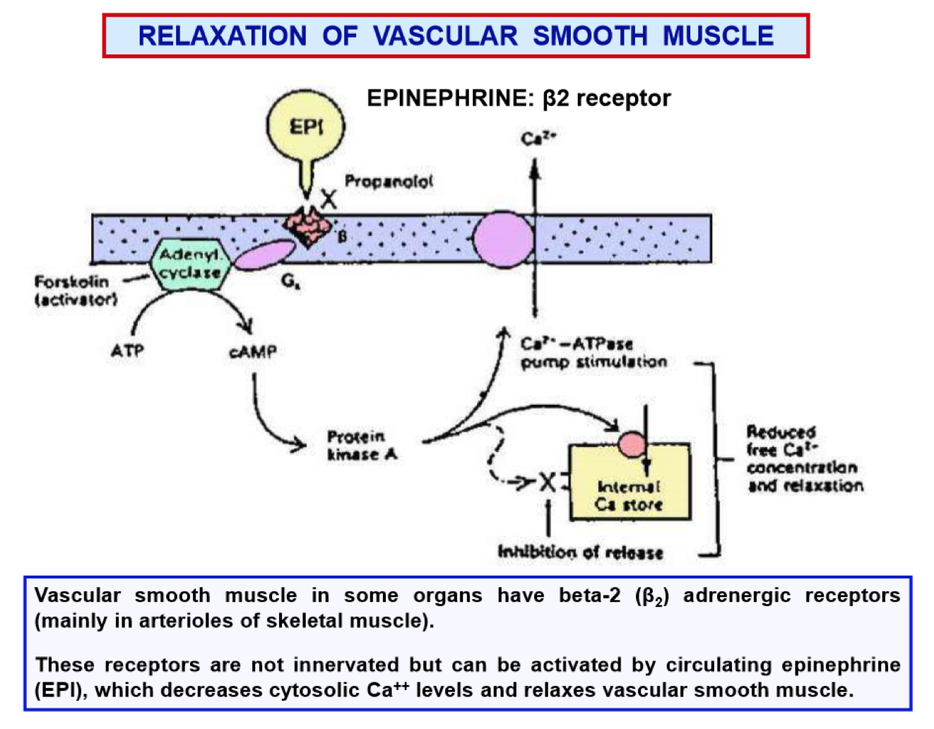 Vascular smooth in some organs have beta-2 adrenergic receptors (primarily skeletal muscle). These respond to circulating epinephrine and lower cytosolic Ca++ levels