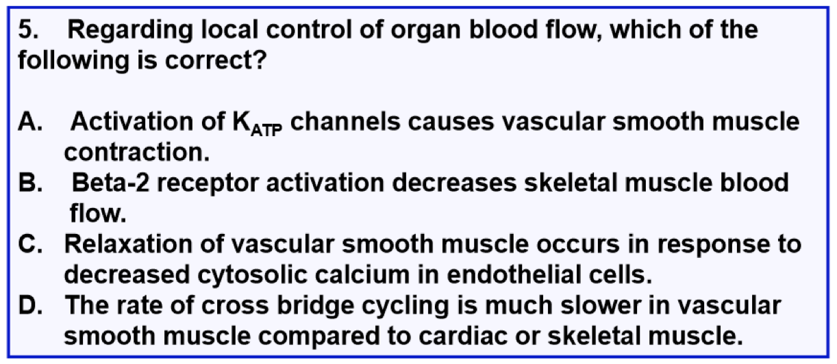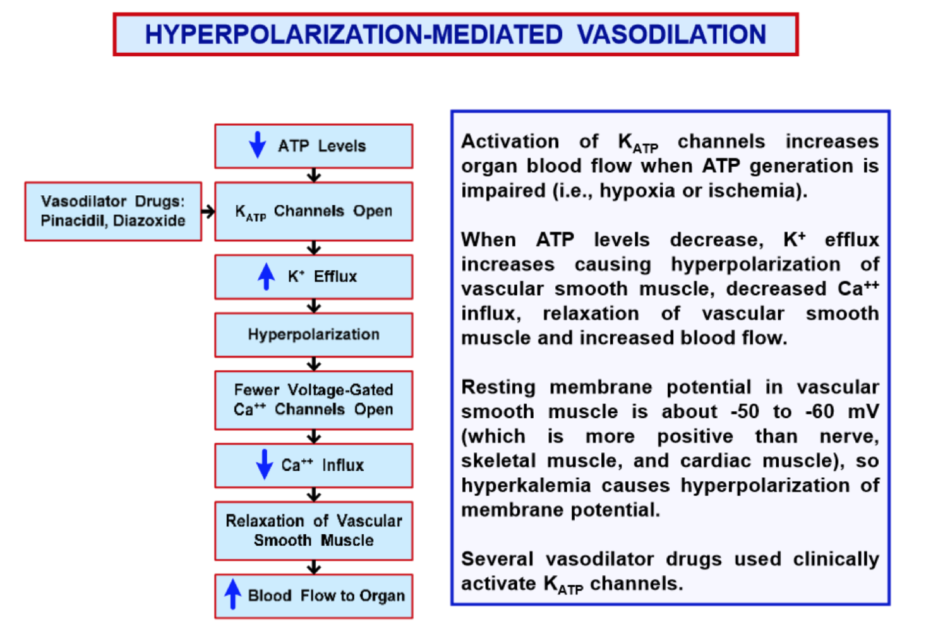 Activation of KATP channels increases organ blood flow when ATP generation is impaired (hypoxia or ischemia). Decreased ATP levels lead to K+ increasing efflux. This causes hyperpolarization of vascular smooth muscle and decreases Ca++ influx, ultimately leading to relaxation of vascular smooth muscle and increased blood flow.