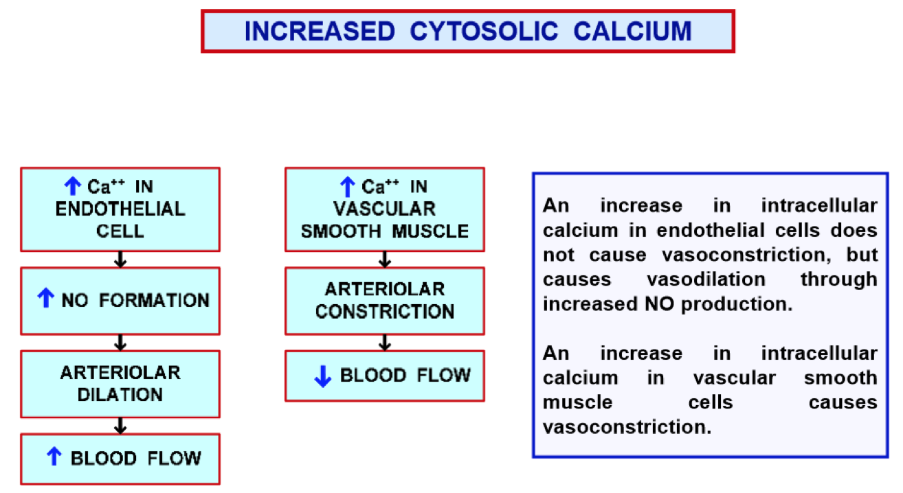 How are the effects of increased cytosolic calcium different between endothelial cells and smooth muscle cells?