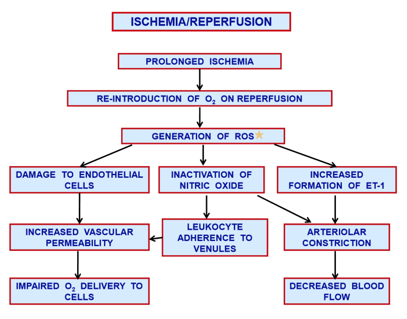 Reprofusion following an ischemic episode can lead to the generation of ROS. These will inactivate NO and promote microvascular injury.