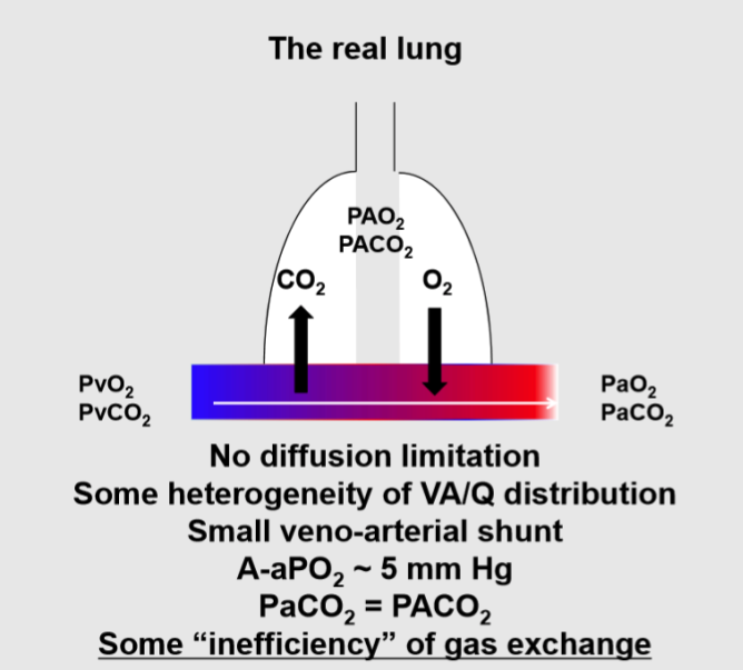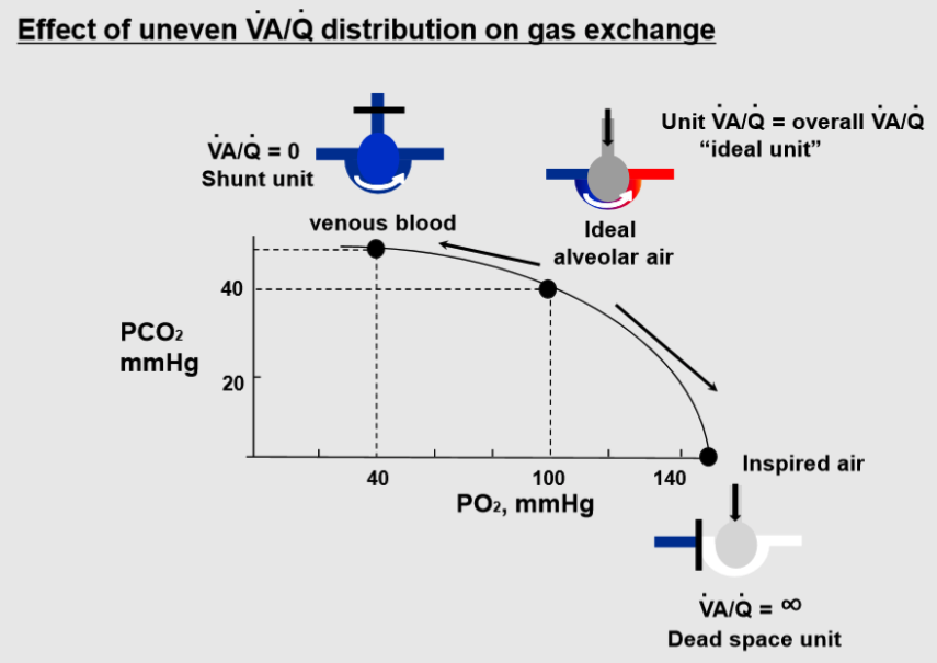 Going on the other direction, as VA/Q decreases from the ideal, the composition approaches that of venous blood. In this case, large decreases in PO2 are accompanied by relatively small increases in PCO2. This means that pathological conditions associated with an increase of shunt units will result in larger decreases in PO2 and consequently in low arterial blood O2 content, while PCO2 will increase relatively less.