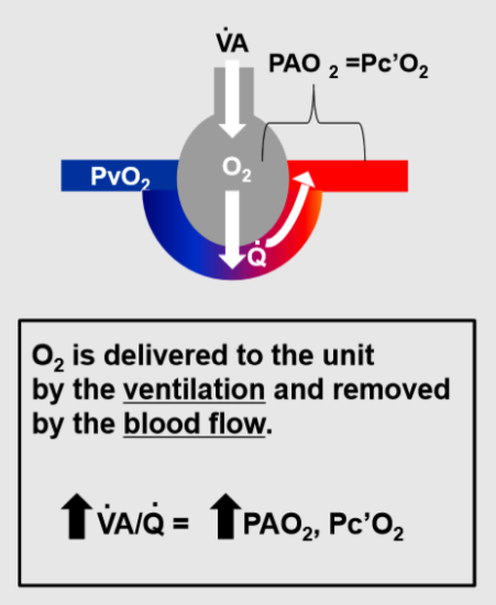 O2 is delivered to the alveolo-capillary unit by the ventilation, and removed from the unit by the blood flow. An increase in the VA/Q ratio will raise PAO2 and Pc’O2; a decrease in VA/Q will have the opposite effect.