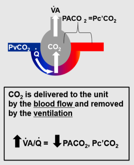 CO2 is delivered to the alveolo-capillary unit by the perfusion, and removed by the ventilation, accordingly, and increase in VA/Q will lower PACO2 and Pc’CO2 ‘ a decrease in VA/Q will have the opposite effect.