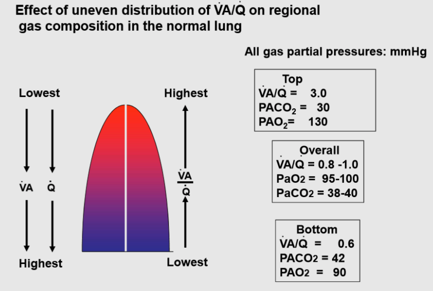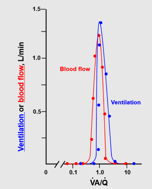 This shows that most V and Q go to areas of the lung that have a VA/Q near 1, and that very little air or blood flow go to areas with VA/Q >> 5 or lower than 0.05.