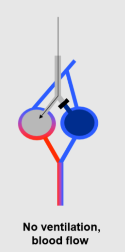The drawing on the left side, shows an area of the lung that does not receive ventilation but receives blood flow. This could be due to obstruction of a bronchus, or to atelectasis as in ARDS or pneumonia. As a result, blood flowing through this area does not pick up any O2 and does not loose any CO2 , and leaves the unventilated area with the same composition of the venous blood entering the lungs. When this stream of blood mixes with the blood leaving the well ventilated areas of the lungs, it tends to lower the PO2 and increase the PCO2 of the mixture. Blood flowing through unventilated areas has the same effect on blood oxygenation as a veno-arterial shunt that bypasses the lung.